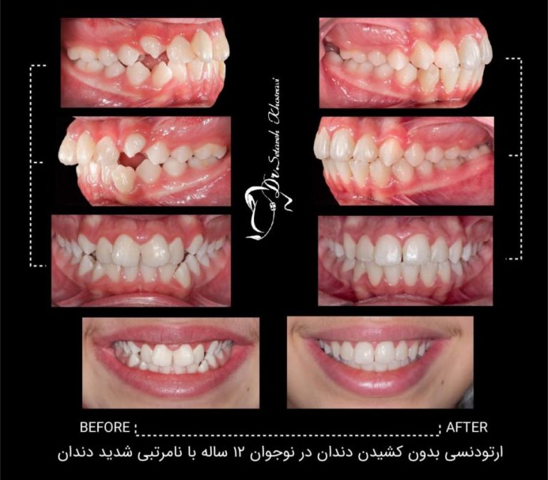 ارتودنسی بدون کشیدن دندان در نوجوان ۱۲ ساله با نامرتبی شدید دندان